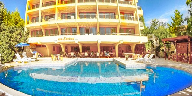 Хотел Екзотика се намира в Златни Пясъци, на 300м. от морето. В хотел Екзотика ще се насладите на уютна обстановка и пълноценна почивка с голям външен басейн. Хотел Екзотика пртедлага всякакви удобства, за да прекарате една отлична морска почивка в Златни Пясъци.